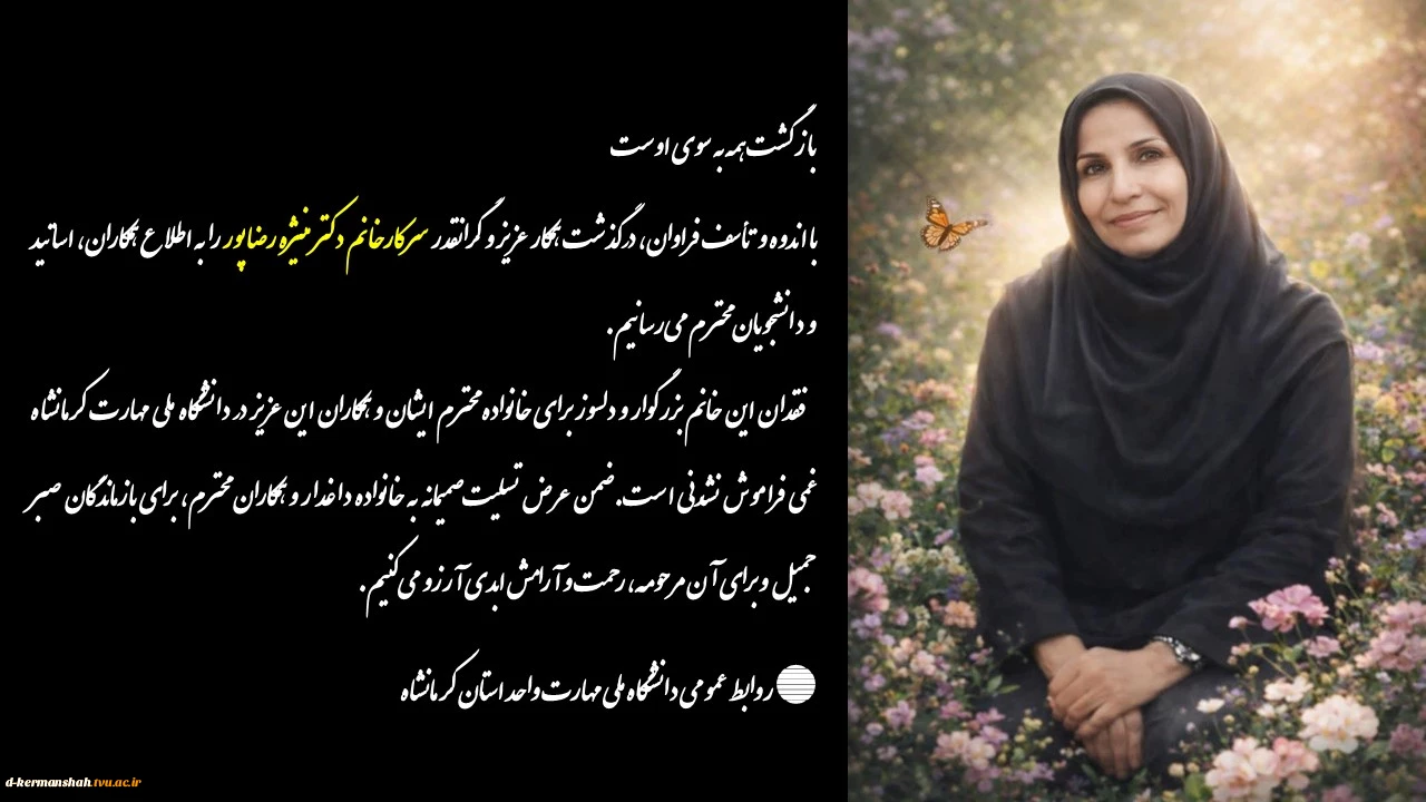 امتیاز دهید : با اندوه و تأسف فراوان، درگذشت همکار عزیز و گرانقدر سرکارخانم دکتر منیژه رضاپور را به اطلاع همکاران، اساتید و دانشجویان محترم میرسانیم. 2 یکشنبه 14 دی 1404 ساعت 18:48
